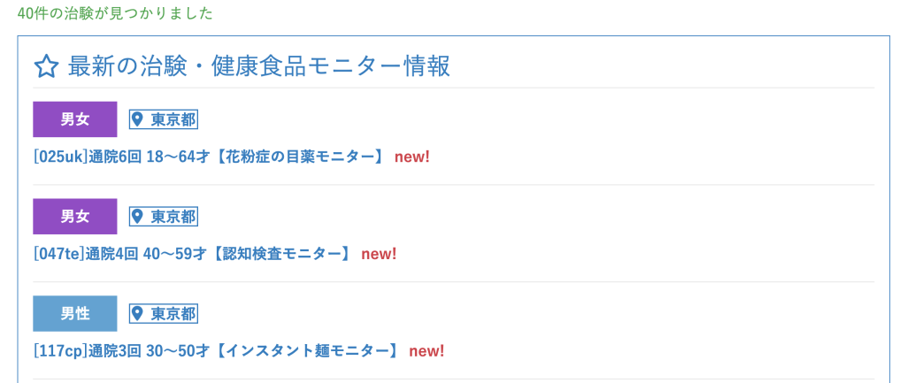 ![]() コーメディカルクラブ | 公式HPを見る▶︎ | ・治験モニター募集サイト ・謝礼は7,000円~35,000円程度 |