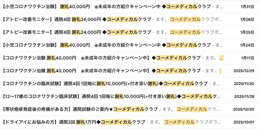 そんな中でも「コーメディカルクラブ」での治験モニターは、短期間でまとまった報酬を得やすい手段である。