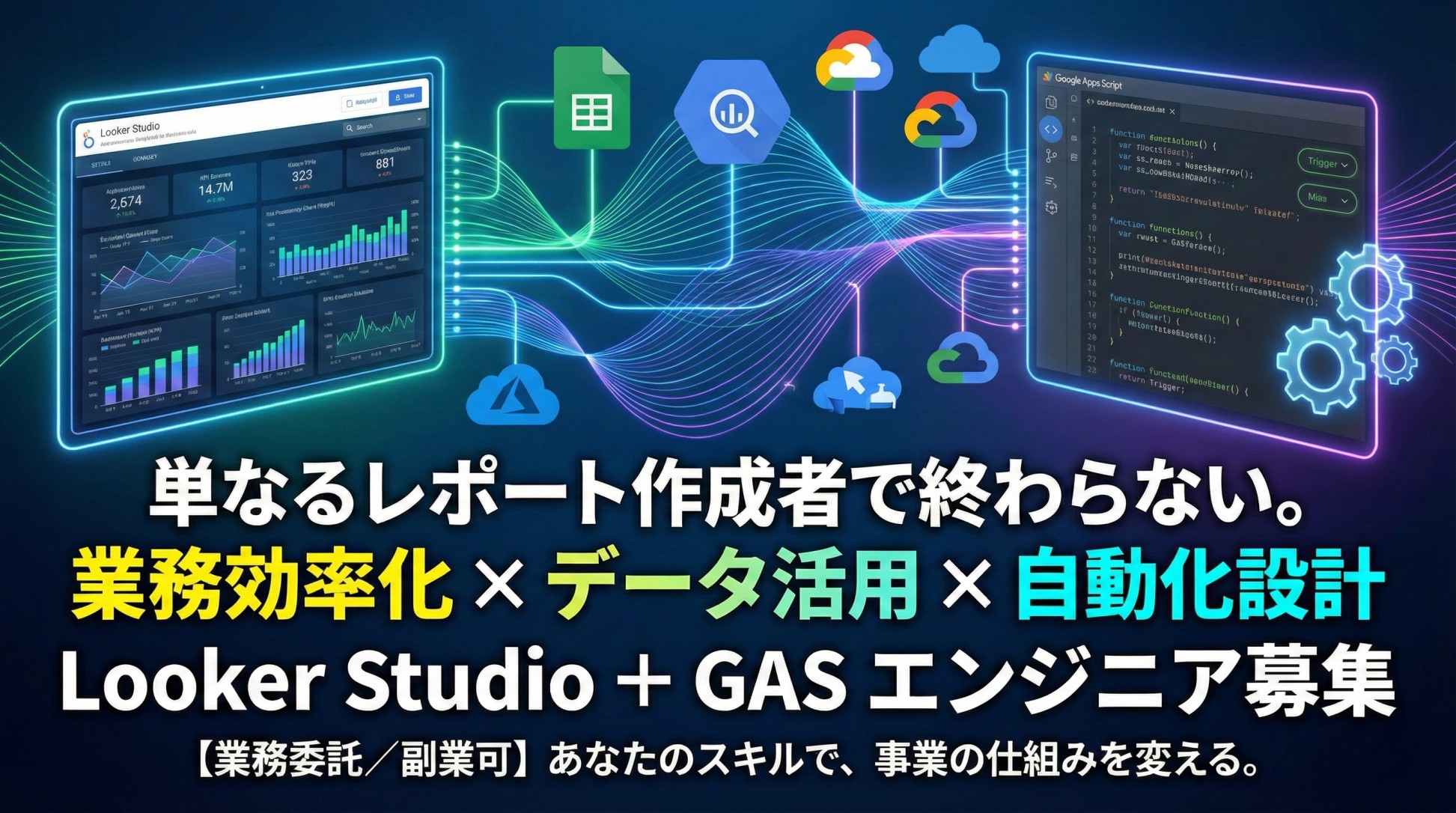 在宅ワークの求人・バイト・お仕事情報ならママワークス > 在宅ワークの求人一覧 > 設計・CADの在宅ワーク求人一覧 > 【副業可】Looker Studioでのレポート作成+GASエンジニア募集 業務効率化 × データ活用 × 自動化設計 最終更新日:2026/02/27 【副業可】Looker Studioでのレポート作成+GASエンジニア募集 業務効率化 × データ活用 × 自動化設計 株式会社ナレッジホールディングス 応募する(新規会員登録) ログイン 募集職種 (契約時の職種) 業務改善・DX推進担当 雇用/契約形態 業務委託 就業場所/業務遂行場所 自由 仕事内容 ■ 募集概要 当社では、お客様に提出するレポート作成や、 社内の集計業務を効率化してくださる方を募集しています。 単なるレポート作成ではなく、 「どうすれば作業をラクにできるか?」を考え、仕組み化できる方を歓迎します。 ■ 業務内容 Looker Studioでのお客様向けレポート作成 広告データ・スプレッドシートなどのデータ連携 月次レポートの自動化設計 Google Apps Script(GAS)を用いた業務自動化 データ整理・加工・集計フローの改善 例) ・毎月手作業で作っているレポートを自動化 ・広告データを自動取得・自動集計 ・フォーム回答を自動整理 ・通知や定型業務の自動化 報酬 時間単価:1,300円(税込)~ ※定期的な業務単価増額制度あり! ※スキル・経験によって相談可能です! 掲載日 2026/02/27 〜 2026/03/31 成果物の納期予定日 業務委託契約書に準ずる 知的財産権の取扱い 業務委託契約書に準ずる 必須スキル Looker Studioでのレポート作成経験 Googleスプレッドシートの活用経験(関数・QUERY等) Google Apps Scriptの使用経験 歓迎スキル BigQueryの使用経験 API連携の実装経験 広告運用データの取り扱い経験 業務フロー改善経験 勤務時間/業務時間 自由 ※平日週3〜5日程度、9:00~18:00の間で1日5~8時間程度の稼働を想定しております! 勤務/業務開始日 即日 選考の流れ 書類選考→オンライン面接→決定 選考期間 即日 こんな人に期待しています 手作業を見ると「自動化したい」と思う方 数字をまとめるのが得意な方 業務を仕組み化するのが好きな方 改善提案ができる方 仕事の期間 長期 報酬の支払期日 月末締め翌月末支払い 支払い方法 銀行振込 諸経費 支給なし 支給対象品目 なし 応募する(新規会員登録) ログイン この企業について確認する この企業の他の求人 ・《お祝金制度・成約報酬有》在宅コールスタッフ★アポイント取得を目指してください!しっかり稼げる長期のお仕事♪ ・【完全リモート×営業職】営業スキルを活かせます♪ご成約時にはインセンティブあり◎経験者・即戦力求めてます!! ・【在宅×営業事務人員増員】スピード命!早ければ早いほどいい!営業事務サポート大募集! ・【在宅×SNSディレクター】アカウントの品質チェックや運用管理など|成果につながる提案求む★高単価で効率よく稼げる♪ ・【在宅×Webデザイナー】デザイン企画/コンテンツ作成などHP作成に関わる幅広い業務をお任せ!経験者の募集◎スキルUP可 ・【完全在宅×LINE構築】時間に縛られない『案件単価制』♪経験を活かして当社の事業を支えてくださる方を募集中! ・【完全在宅×SNS運用】時間に縛られない『案件単価制』♪経験を活かして当社の事業を支えてくださる方を募集中! ・【カスタマーサポート】★在宅でお客様の成功をサポート!“ありがとう”がやりがいに!SNS運用&カスタマー対応のお仕事♪ ・【在宅×事務】SNSシステムの連携サポートスタッフ募集!もくもく作業が得意な方歓迎♪ ・【完全在宅】スピード感重視!主体的に動ける方歓迎!ルールをつくる楽しさを味わおう!成長企業の社長を支える在宅秘書募集♪ ・【在宅×SEOライター】弊社メンバーのSNS更新&ショートムービーシナリオ作成募集! ・【在宅×SNS広告運用スタッフ】データ分析を活かし、最適な広告運用を担うメンバーを募集 ・【SNS映像制作】あなたの編集がブランドの未来を創る!SNS動画編集スタッフ募集!“魅せる”編集で、企業の成長を加速! ・【在宅×営業事務人員増員】◎マルチタスクがお好きな方ピッタリです◎ ・【完全在宅×バックオフィス】補助金事務サポート経験者のみなさま即戦力としてお迎えします!副業◎ ・【カスタマーサポート】★在宅でお客様の成功をサポート!“ありがとう”がやりがいに!SNS運用&カスタマー対応のお仕事♪ ・【完全在宅×SNSディレクター】好き×得意でお店を応援!センスが活きる ・【動画編集】あなたの編集がブランドの未来を創る!SNS動画編集スタッフ募集!“魅せる”編集で、企業の成長を加速! ・【コーディング】★WORDPRESS.COMを用いたサイト制作チームを作ります♪コーダーさん募集♪ ・【急募】在宅秘書募集中!変化する組織に抵抗が無い方、大歓迎です! ・▶︎フルリモート×Webデザイナー|HPのデザイン構築をお任せ!クライアントワーク経験のある方大歓迎★ ・AI時代のWebサポートスタッフ募集(HP×SNS連携サポート)完全在宅|チャット対応 ・Webマーケティング カスタマーサクセス【マーケティング担当】(SEO・MEO・S