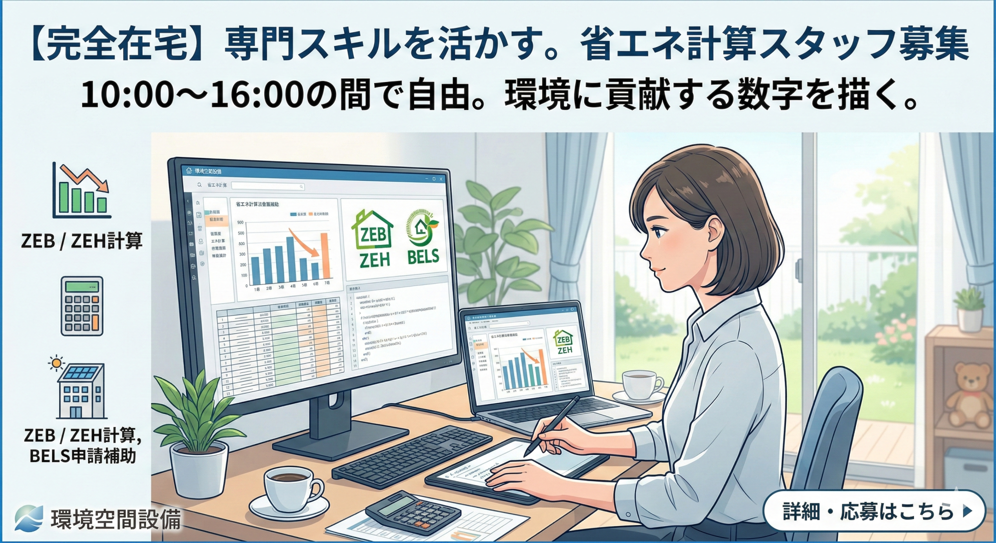 関連コラム Let’s start“在宅ワーク” 在宅ワークをはじめる時に必要なことって? これから在宅ワークを考えている方に知っておいて欲しい情報が満載です! コラム一覧を見る > 在宅ワーカー体験談 在宅ワークにはどんな仕事があるのでしょうか。 様々な在宅ワーカーの仕事についてリアルな声をご紹介♪ コラム一覧を見る > 在宅で働きやすい環境づくり 在宅ワークをする際に重要になってくる、ご自宅の環境。 現役の在宅ワーカーが働きやすい様々なアイデアをご案内しています。 コラム一覧を見る > おすすめコラム 主婦が安全に働ける在宅ワーク20選!仕事選びのポイントも押さえよう★ コラムを見る > パソコン一つで一人でも自宅でできる仕事をドーンとご紹介♪ コラムを見る > 自宅でできる仕事に役に立つ資格とは?在宅ワークを考えている方必見です! コラムを見る > 体験談からわかる在宅ワークの実態をご紹介! 在宅ワークの選び方。怖い案件の見分け方など紹介します! コラムを見る > 地方法人特別税とは?計算や申告納付の方法・地方法人税との違いについて コラムを見る > あなたは知ってる?慶弔費の正しい処理の仕方について詳しく解説します♪ コラムを見る > 在宅WEBライターの文字単価について徹底解説!まずはコツコツ実績作りから♪ コラムを見る > クラウドソーシングは稼げる?必要なスキルや高収入を得られるジャンルをご紹介 コラムを見る > 専業主婦のメリット・デメリットを紹介!在宅ワークがオススメの理由は? コラムを見る > 在宅ワーク求人サイト【ママワークス】をご覧の皆様 株式会社環境空間設備の求人をお探しなら、「アイドマ・ホールディングズ」が運営する【ママワークス】をご利用ください。 省エネ計算書の作成に関する在宅ワーク求人を豊富に掲載しております。