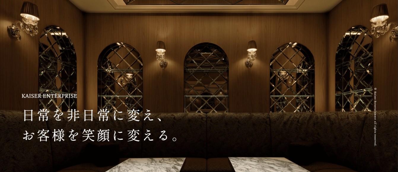私たちカイザーエンタープライズは、日常を特別なひとときへと変え、お客様に“感動”と“ありがとう”を届けるエンターテインメント企業です。 六本木・北新地・宮古島をはじめ全国19店舗を展開し、メディアでも多数取り上げられる日本最大級の高級キャバクラ『UNJOUR東京』を運営しています。 2024年度には年商130億円を達成し、2025年度は170億円着地予想と、右肩上がりの成長を継続中。 2026年にも新店舗出店を控え、今後も200億円、300億円とさらなる拡大を計画しております