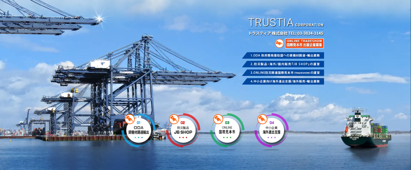 弊社、トラスティア株式会社は、小まわりのきく商社としてODA(政府開発援助)事業における、開発途上国への 資機材調達を行っています。 日本が開発途上国へ必要とされる物資を、安全に正確に迅速に届けることは国際的社会貢献であり、弊社もその一端を担っています。 弊社はこれまで培ってきた諸外国とのつながりや、物流のノウハウを活かし貿易・物流の課題をひとつひとつクリアしながら、新たなワールドワイドビジネスを展開してく所存です。 弊社開発による、防災関連商品専門のECサイト「JB SHOP」もその試みの一つです。地球規模で襲いかかる異常気象に、世界中の多くの人々が生命の危険に直面しています。 JB SHOPは、秀逸な日本の防災関連製品を世界中にお届けします。 そして、このたび新たにオンライントレードショー(国際見本市)サイトを開設する運びに至りました。トレードショーの特長として、JB SHOPと連動してその場で防災関連商品を購入できる 仕組みを導入しています。トレードショーは商品情報発信のみならず、災害多発国として過去幾多の大規模災害から培った”防災技術”、”防災関連アプリ等の提供サービス”を 扱う企業が、海外に向けての情報発信の場としてご利用いただきたいと願っております。 日本で生まれ活躍している防災関連商品は、世界中の人々の生命を救い、守っていくことができると確信しております。今後はより多角的ご提案とサポートを充実させ、国を超えたビジネスに 積極的な国内外の企業のお役に立てるよう努力してまいります。海外進出や販路開拓を検討されている企業におかれましては、ぜひ弊社にお気軽にお声がけください。